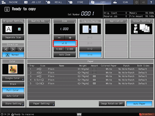 • [Auto Zoom] or [x1.0] may not be selected automatically if the initial setting has been changed. The default setting can be changed from [Job Reset Setting] on the [UTILITY] screen. For details about [Job Reset Setting], refer to Job Reset Setting: Setting the Function Reset Conditions.