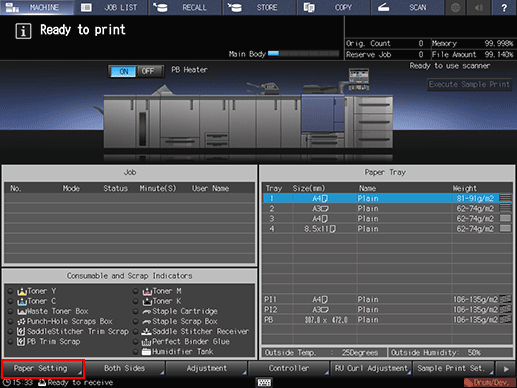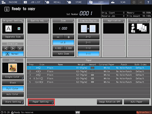 Each paper tray has been preset with paper specifications. If you want to use another paper type than any loaded in the trays, follow the procedure below to change the [Paper Setting].