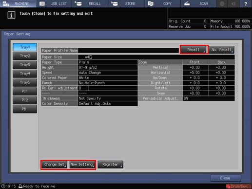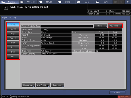 Pressing [Recall] displays the [Recall] screen, on which registered paper specifications can be selected. Proceed to step 7.