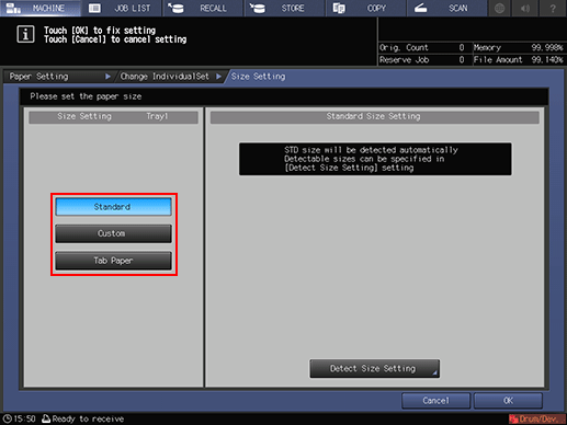 With [Standard] selected, the machine automatically detects the standard size when loaded with standard size paper in that tray.