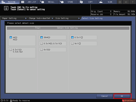 Press [Detect Size Setting]. The [Detect Size Setting] screen is displayed.