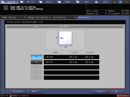 After entering the value, press [Size Registration]. The [Size Registration] screen is displayed.