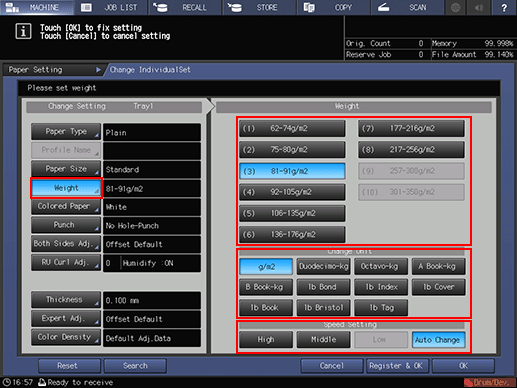 Process speed can be selected from the keys under [Speed Setting]. Some speed settings cannot be selected depending on the paper weight. Select the desired button.