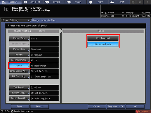 Select [Pre-Punched] when loading sheets with punched holes, and select [No Hole-Punch] when loading sheets without punched holes.