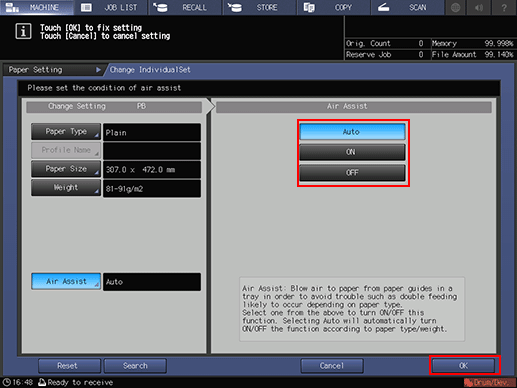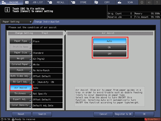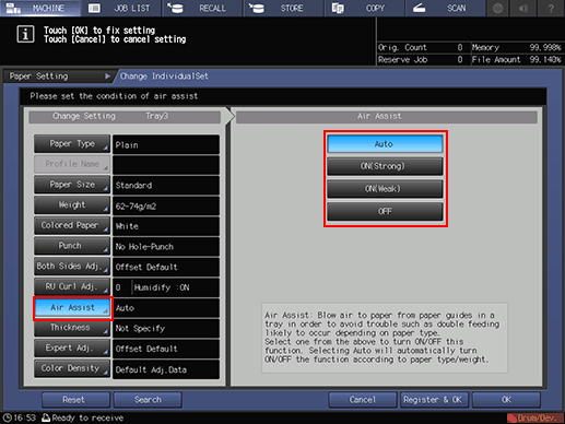 If you select [Tray 3] of Large Capacity Unit LU-202m or Large Capacity Unit LU-202XL in step 5 and then press [Air Assist], the following [Air Assist] setting screen is displayed.