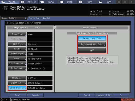 This setting is enabled when [ON] is selected for [Use Color Density Control], accessed from [Color Density Control] - [Basic Setting] on the [Adjustment Menu] screen.