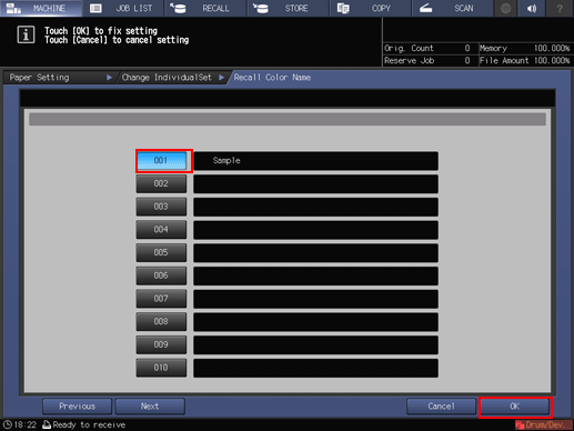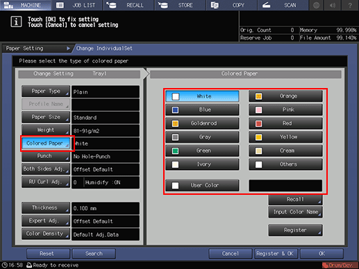 To change the specified color name, press [Input Color Name] to display the [Input Colored Paper Name] screen and rename it.