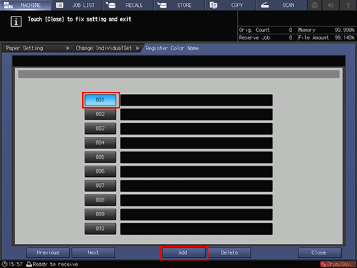 Press the number key on the left side of the desired entry, then press [Add]. The [Custom Size Name Setting] screen is displayed.