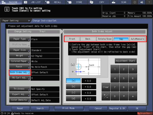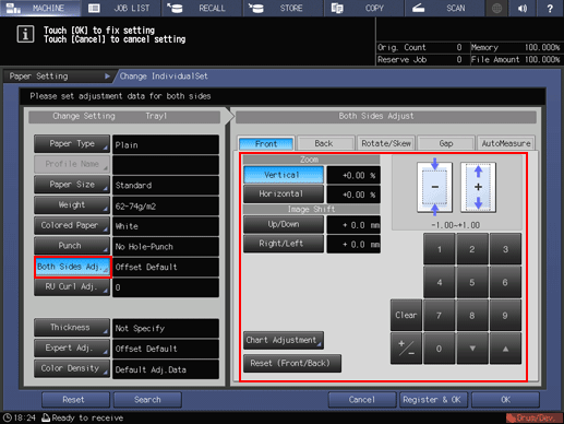 If you change settings of [Zoom] of [Front] or [Back], [Image Shift], [Rotate/Skew], and [Chart Adjustment], or perform the [Gap] or [Scan Meas.] adjustment, the indication of [Both Sides Adj.] on the [Change Individual Set] screen is changed to [Offset Changed].