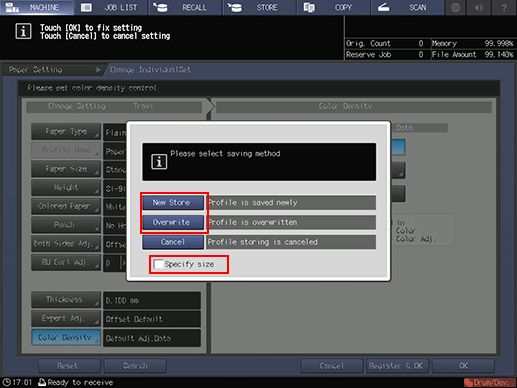 If [Overwrite] is selected, data is overwritten by the registered paper condition.