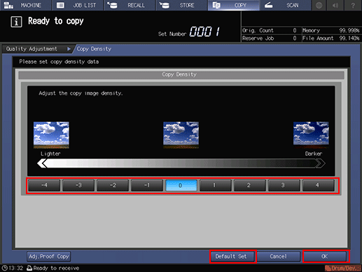 After making the desired adjustment, press [Adj.Proof Copy] on the [Quality Adjustment] screen, [Adj.Proof Copy] on the [Copy Density] screen, or Proof Copy on the control panel. Check the adjustment result with output image.