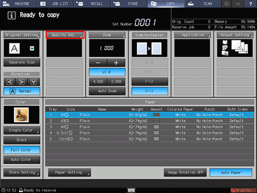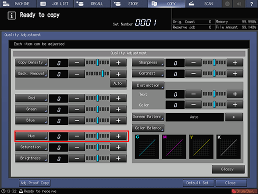 After making the desired adjustment, press [Adj.Proof Copy] on the [Quality Adjustment] screen, [Adj.Proof Copy] on the [Hue] screen, or Proof Copy on the control panel. Check the adjustment result with output image.