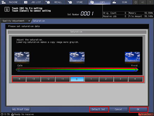 After making the desired adjustment, press [Adj.Proof Copy] on the [Quality Adjustment] screen, [Adj.Proof Copy] on the [Saturation] screen, or Proof Copy on the control panel. Check the adjustment result with output image.