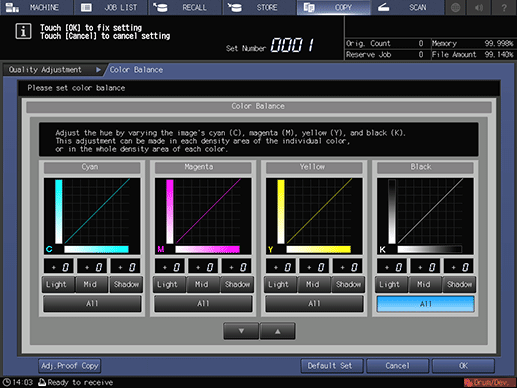 After making the desired adjustment, press [Adj.Proof Copy] on the [Quality Adjustment] screen, [Adj.Proof Copy] on the [Color Balance] screen, or Proof Copy on the control panel. Check the adjustment result with output image.