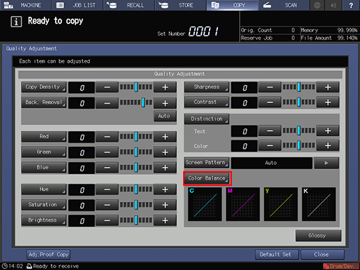 The screen returns to the [COPY] screen. The [Color Balance] indication can be found under [Quality Adj.] on the [COPY] screen.