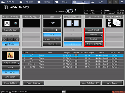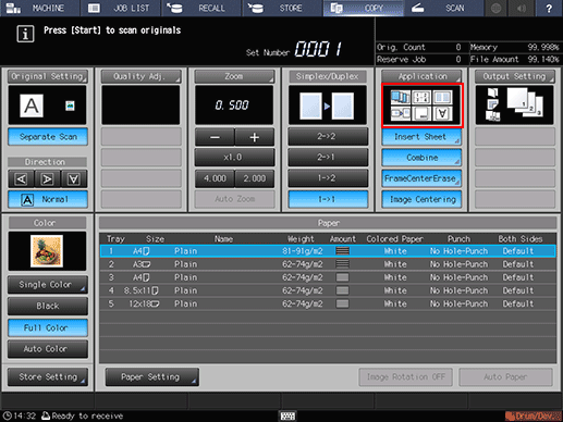 Up to 4 shortcut keys for frequently-used application settings can be displayed under [Application] on the [COPY] screen. These keys allow you to set the application function at a single touch, or to directly jump to the setting screen for each. The setting of shortcut keys can be made from [User Setting] in UTILITY.