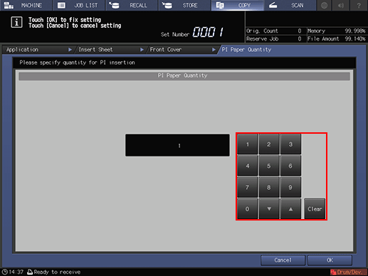Insertion setting | In the post inserter, up to 40 covers can be added, Press [Insertion Setting], enter the number of sheets using the keypad on the screen, then press [OK]. |