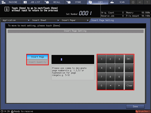 Enter the insert page number using the keypad on the screen. When specifying multiple pages, delimit them with a comma (,). When specifying the range, insert a hyphen (-) between page numbers. Up to 20 characters can be specified, including a command hyphen.