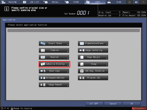 To cancel the Adhesive Binding function with the current setting saved, press [Function OFF].