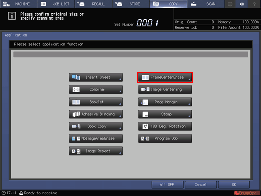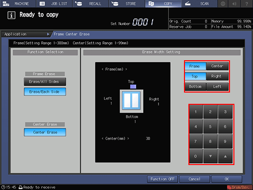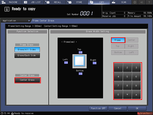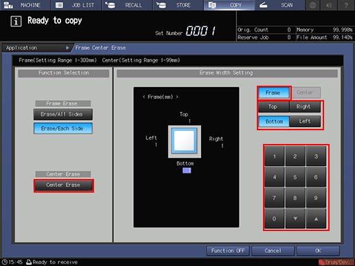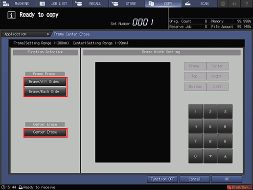 Check that the center erase width under [Erase Width Setting] is highlighted. Use the touch panel keypad or [