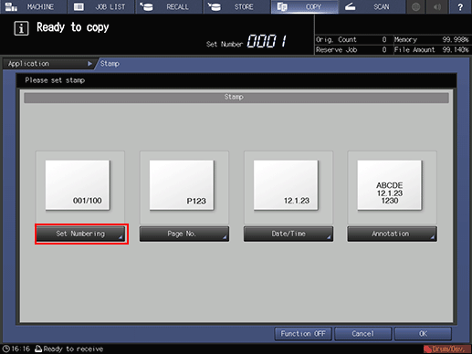 To cancel the Stamp function with the current setting saved, press [Function Off].