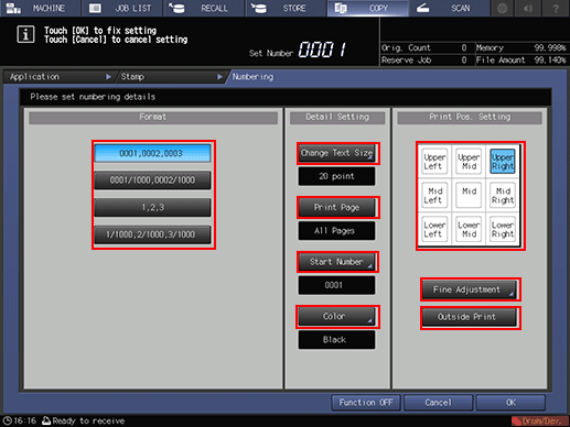 [Print Pos. Setting] | Select one of the 9 printing positions provided under [Print Pos. Setting]. If fine adjustment is desired, press [Fine Adjustment]. Press [Outside Print] to print numbering on the outside edges of facing pages. |