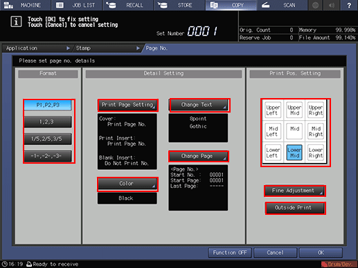 [Print Pos. Setting] | Select one of the 9 printing positions provided under [Print Pos. Setting]. If fine adjustment is desired, press [Fine Adjustment]. Press [Outside Print] to print page numbers on the outside edges of facing pages. |