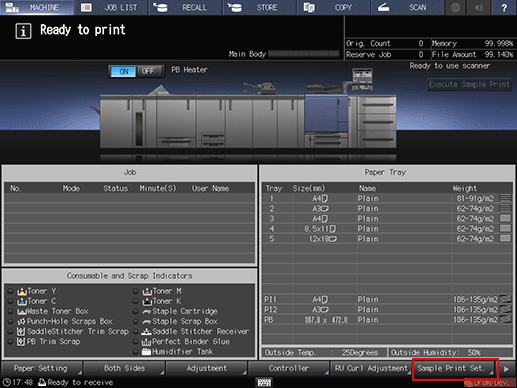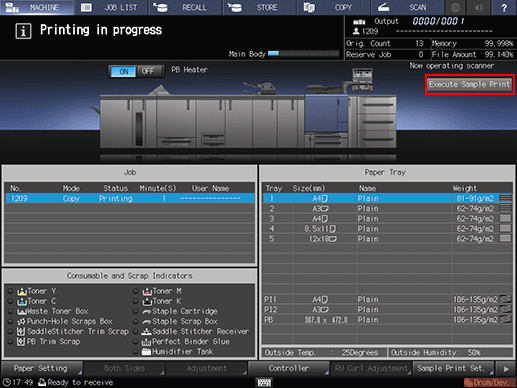 The [Execute Sample Print] button is displayed on the [MACHINE] screen while printing is in progress. Press the key at the desired moment to output the same image as that currently printed to the secondary tray, so that you can check the quality of printed image at that time.