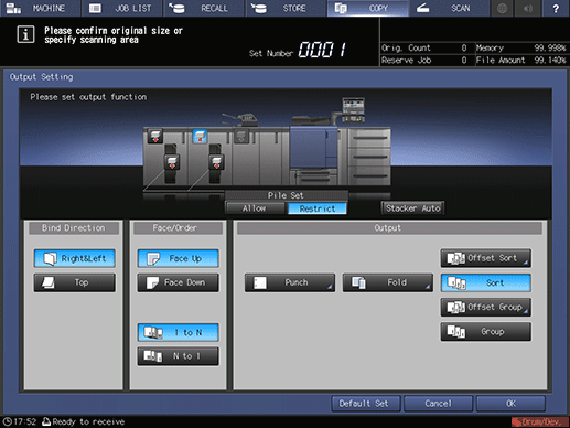 When Large Capacity Stacker LS-506 is mounted, [Pile Set] is displayed. If two Large Capacity Stacker LS-506 units are mounted, [Stacker Auto] is displayed. For details, refer to Switching Stacker Automatically.