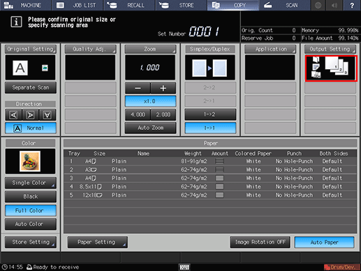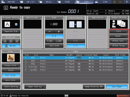 Up to 4 shortcut keys for frequently-used output settings can be displayed under [Output Setting] on the [COPY] screen. These keys allow you to set the output function at a single touch, or to directly jump to the setting screen for each. The setting of shortcut keys can be made from [User Setting] in Utility Menu.