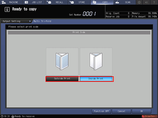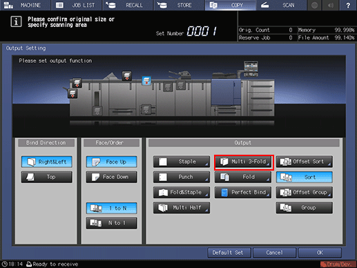 The machine with Saddle Stitcher SD-506 mounted can fold a copied set inside in three. Using [Multi Tri-Fold], the print side can be specified. Finished sets are delivered to the multi tri-fold mode tray.