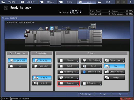 When Saddle Stitcher SD-513 equipped with Creaser Unit CR-101 is mounted on this machine, paper can be creased.