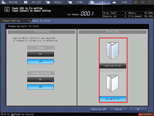 [Multi Tri-Fold] Select [Crease] - [ON] on the [Multi Tri-Fold] setting screen. | Two creases are applied to the paper part folded in three. In this case, only one sheet can be folded. Multi Tri-Fold is not carried out. |