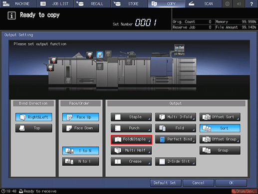 The number of original pages to be loaded is set to that for Fold & Staple, and the number of folded and stapled sheets is determined. For information on the number of sheets folded in Fold & Staple, refer to Saddle Stitcher SD-513.