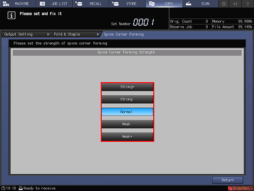 [Fold & Staple] (+ [Fore-edge Trimming]) Select [Spine Corner Forming] - [ON] on the [Fold & Staple] Setting screen. | In [Spine Corner Forming Strength], select the desired one from [Strong+], [Strong], [Normal], [Weak], or [Weak+] |