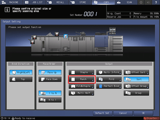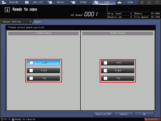 Punches file holes in output sheets. Follow the procedure below to select 2-, 3-, or 4-hole punch and punch position.