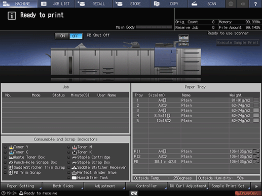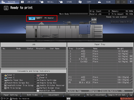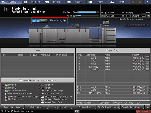 Press [ON] for the inner heater switch for the perfect binder provided on the [MACHINE] screen to start the heater of the perfect binder warming up. The message right to the inner heater switch for the perfect binder is changed to [PB Shut Off] to [PB Warming Up].