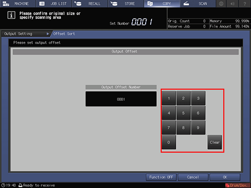 Selecting [Offset Sort] or [Offset Group] displays the [Output Offset] setting screen. Use the touch panel keypad to enter the desired number of sets to be offset. Available range is from 1 to 9,999. When finished with the entry, press [OK].