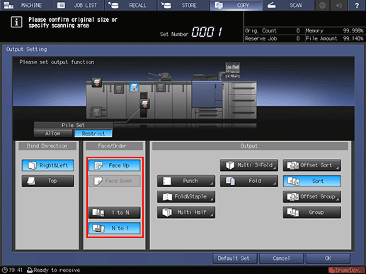 Combined with the output modes above, you can also select the desired Face ([Face Up] or [Face Down]) and Order ([1 to N] or [N to 1]), as needed.
