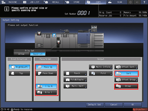 Select the desired Face ([Face Up] or [Face Down]) and Order ([1 to N] or [N to 1]), as needed.