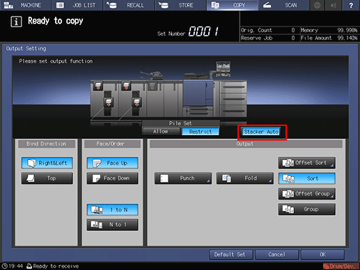 The Stacker Auto function operates as mentioned above only when both stacker 1 and stacker 2 are free from trouble, when no paper remains in the stacker 2, and when [Allow] is selected for Pile Set function.