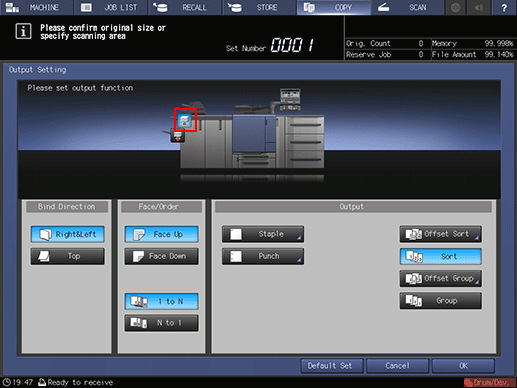 A machine mounted with Finisher FS-531 is initially set to output sorted sets to the primary (main) tray, regardless of whether or not to be equipped with other options. Follow the procedure below to change the output tray and select the desired output mode.