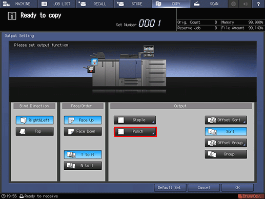 • To resume the previous setting, press [Cancel]. To cancel the Punch function with the current setting saved, press [Function OFF]. The screen returns to the [Output Setting] screen.