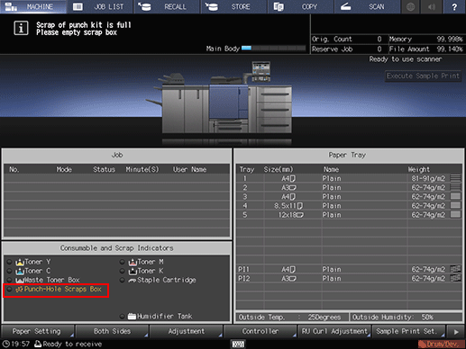1. Press the [Punch-Hole Scraps Box] indicator in the Consumable and Scrap Indicators area of the [MACHINE] screen.