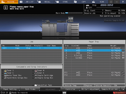 At this time, the message [Please remove paper from main tray exit] appears in the message area of the screen, and the Start LED turns orange. The machine cannot resume printing even if you press Start on the control panel.