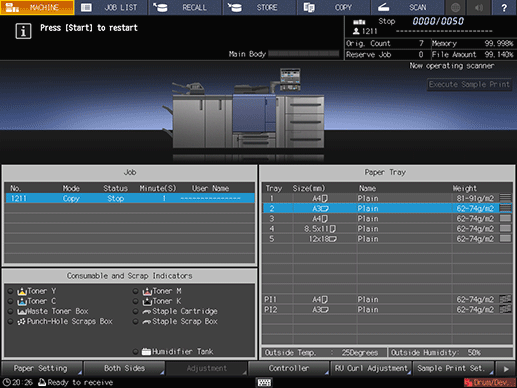 When the primary (main) tray goes up completely, the message [Press Start to restart] is displayed.