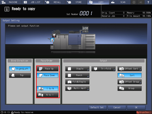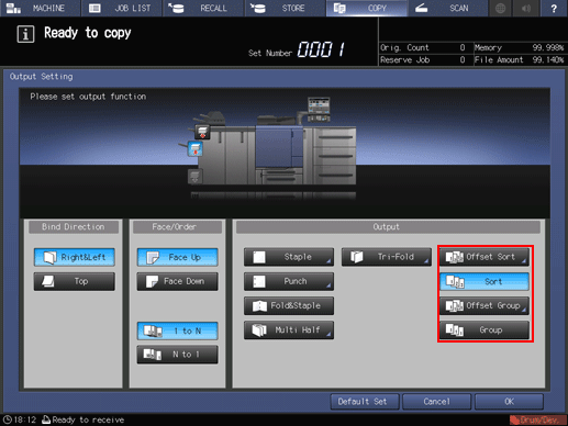 A machine mounted with Finisher FS-612 is initially set to output sorted sets to the primary (main) tray, regardless of whether or not to be equipped with other options.