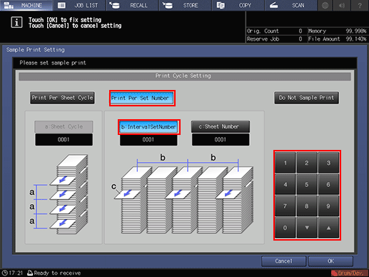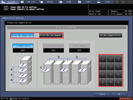 • Selecting [a: Sheet Cycle] of [Print Per Sheet Cycle] allows you to specify the number of sheets in a cycle from 1 to 9,999. Set number is not canceled even if the sub power switch is turned off, Auto Reset is activated, or Reset on the control panel is pressed. To change the setting, press [Sample Print Set.] in the [MACHINE] screen.
