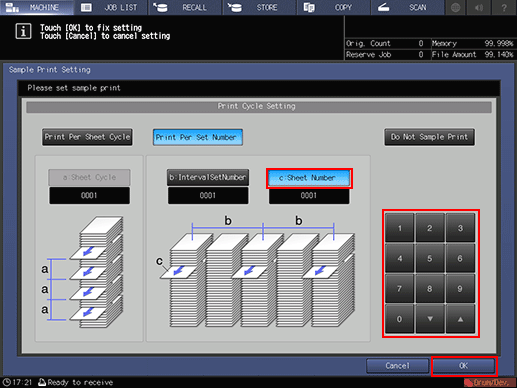 • Selecting [Print Per Set Number] requires the settings of [b: IntervalSetNumber] to set the count for making a sample print, and [c:Sheet Number] to set the page number of the set to be printed as a sample. Setting range for [b: IntervalSetNumber] is from 1 to 9,999. Setting range for [c:Sheet Number] is from 1 to 9,999.