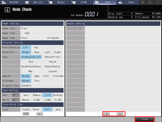 The current settings of [Paper Setting], [Original Setting], [Zoom Setting], [Color/Print Side], and [Quality Adjustment] are displayed in the left side area of the [Mode Check] screen. To switch the display, press [